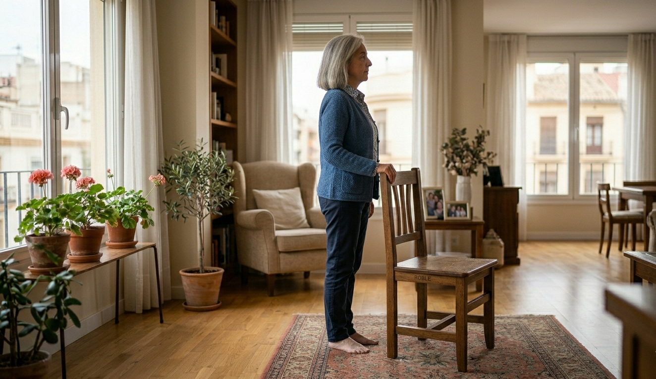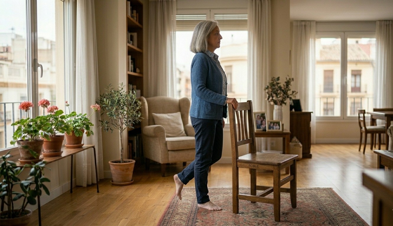 El ejercicio de equilibrio en un pie es una práctica básica que puede adaptarse fácilmente utilizando un punto de apoyo, como una pared, una mesa o el respaldo de una silla. Este apoyo permite avanzar de forma progresiva, respetando el ritmo de cada persona.